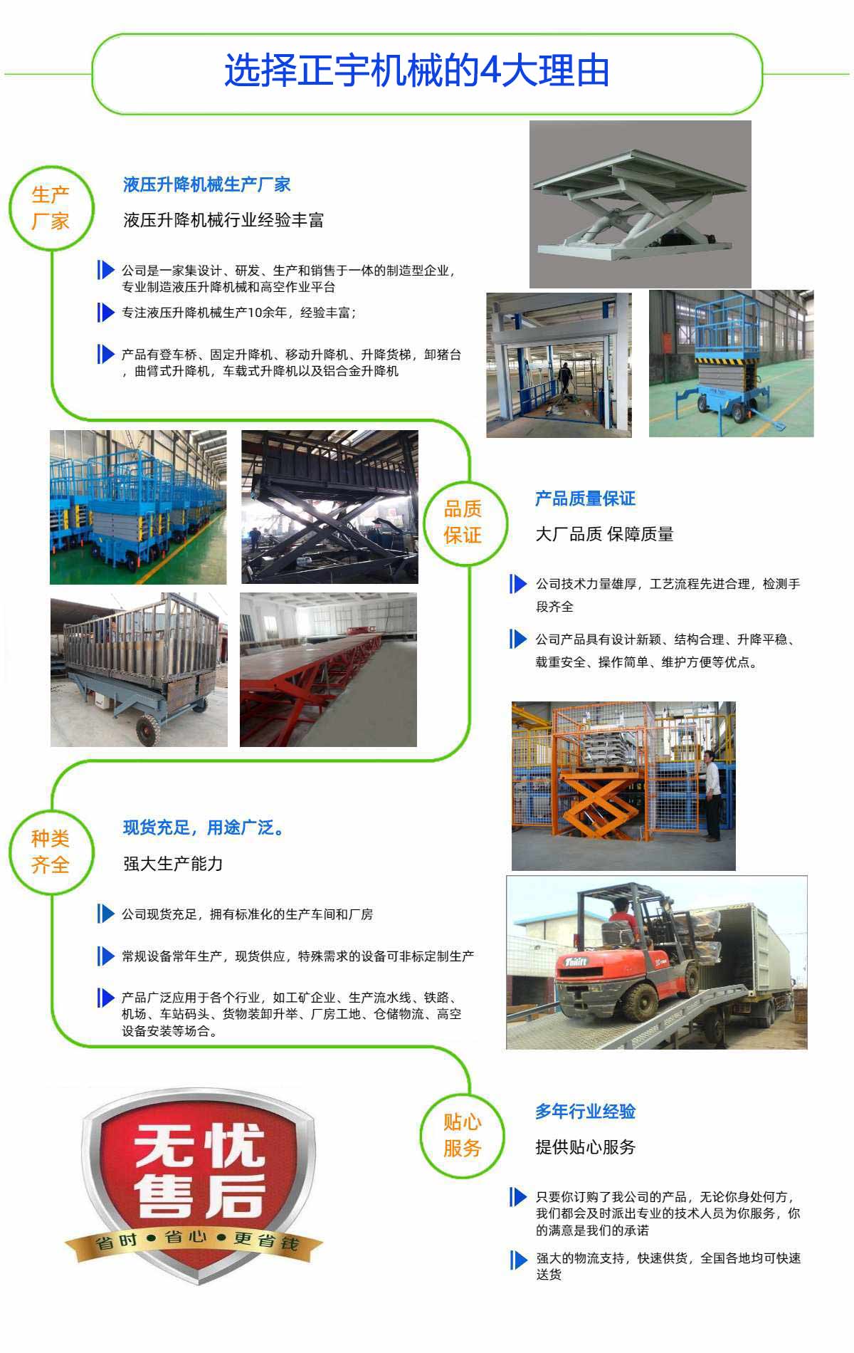 濟(jì)南正宇升降機(jī)械有限公司是一家集設(shè)計(jì)、研發(fā)、生產(chǎn)和銷(xiāo)售于一體的制造型企業(yè),生產(chǎn)液壓升降機(jī)械和高空作業(yè)平臺(tái),公司處于素有泉城美稱(chēng)的山東省濟(jì)南市,坐落于濟(jì)北開(kāi)發(fā)區(qū)。優(yōu)越的地理位置和便利的交通給公司的發(fā)展帶來(lái)了充分的條件。正宇液壓技術(shù)力量厚,工藝流程先進(jìn)合理,檢測(cè)手段齊全。目前主要產(chǎn)品有:高空作業(yè)平臺(tái)、登車(chē)橋、固定升降機(jī)、移動(dòng)升降機(jī)以及鋁合金升降機(jī)等等。公司產(chǎn)品具有設(shè)計(jì)新穎、結(jié)構(gòu)合理、升降平穩(wěn)、載重安全、操作簡(jiǎn)單、維護(hù)方便等優(yōu)點(diǎn)。產(chǎn)品廣泛應(yīng)用于各個(gè)行業(yè),如工礦企業(yè)、生產(chǎn)流水線(xiàn)、鐵路、機(jī)場(chǎng)、車(chē)站碼頭、貨物裝卸升舉、廠(chǎng)房工地、倉(cāng)儲(chǔ)物流、高空設(shè)備安裝等場(chǎng)合。公司以誠(chéng)信、創(chuàng)新、穩(wěn)健為宗旨,以品質(zhì)、完善服務(wù)的理念,迎接市場(chǎng)的挑戰(zhàn)。期待您的咨詢(xún)!